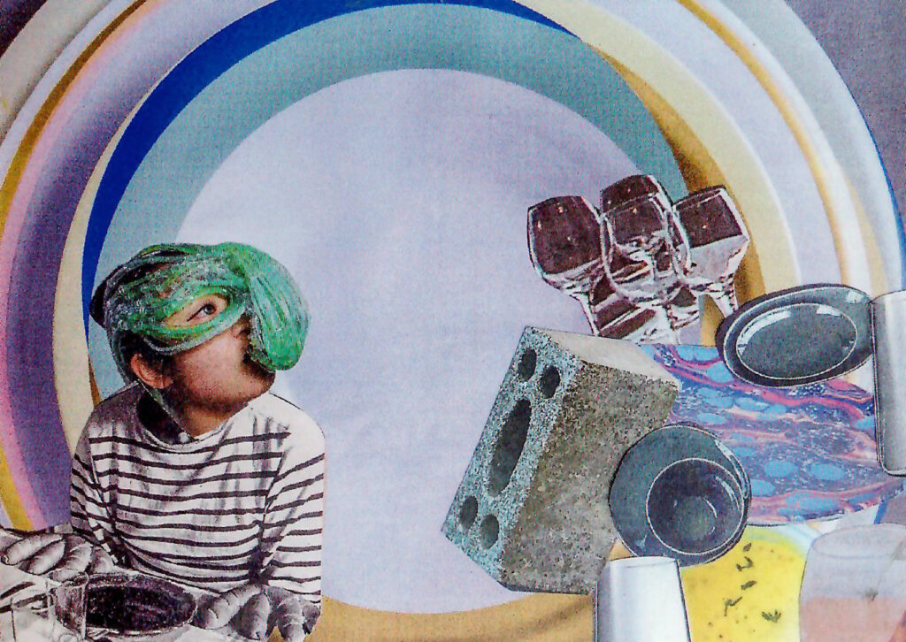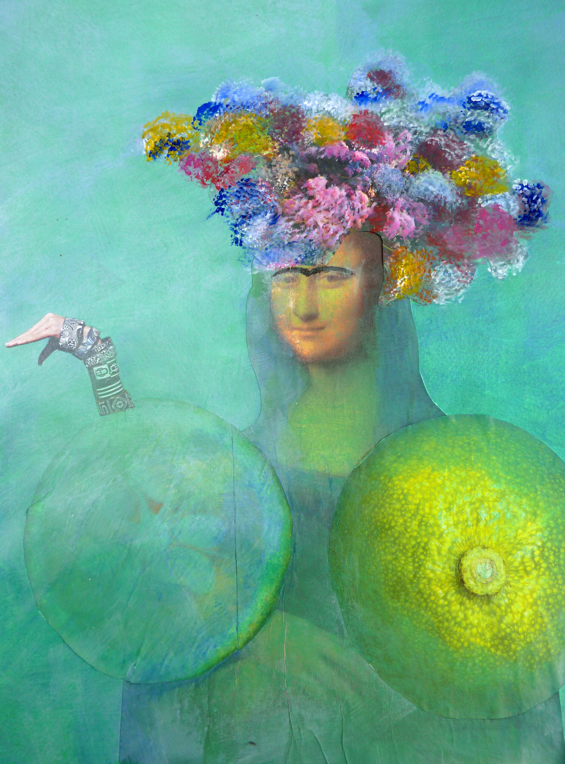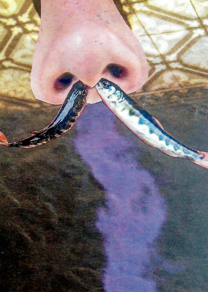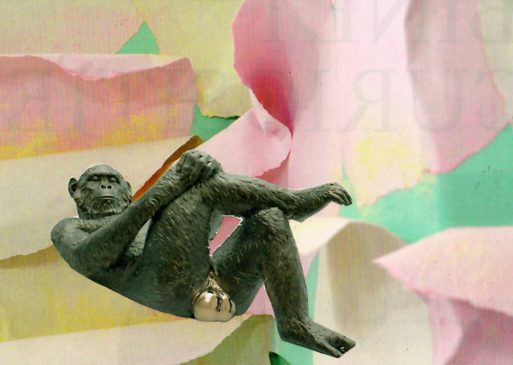 Einige meiner Collagen sind aus der Not entstanden, als auf der Alp kein anderes Material zur Verfügung stand. Bilder aus alten Zeitungen oder Zeitschriften regen meine Fantasie an und geben ein Thema vor. Mit Ironie und Scharfsinn und «bewaffnet» mit Leim und Schere entstehen Bilder im Fokus der Kunst.