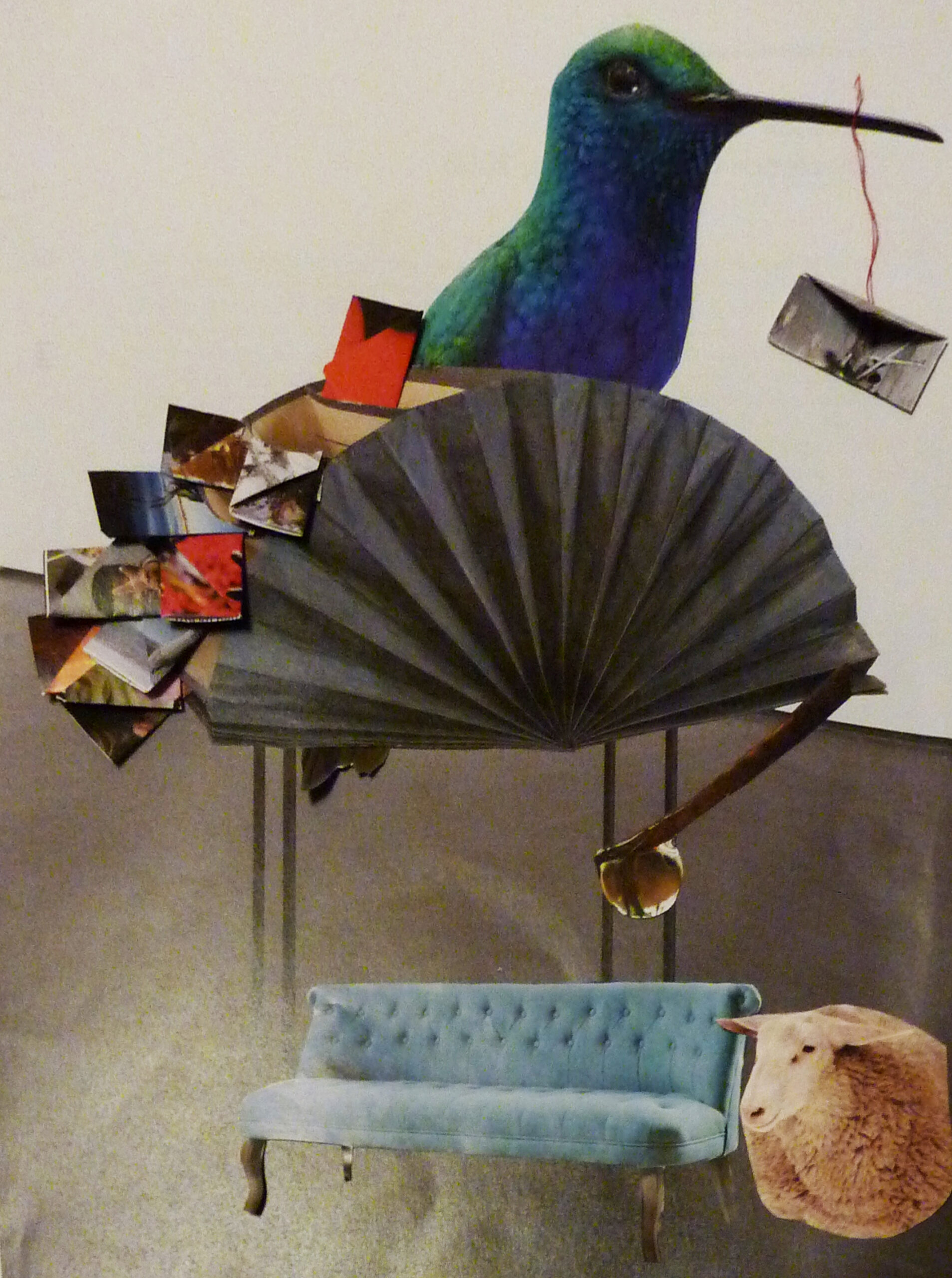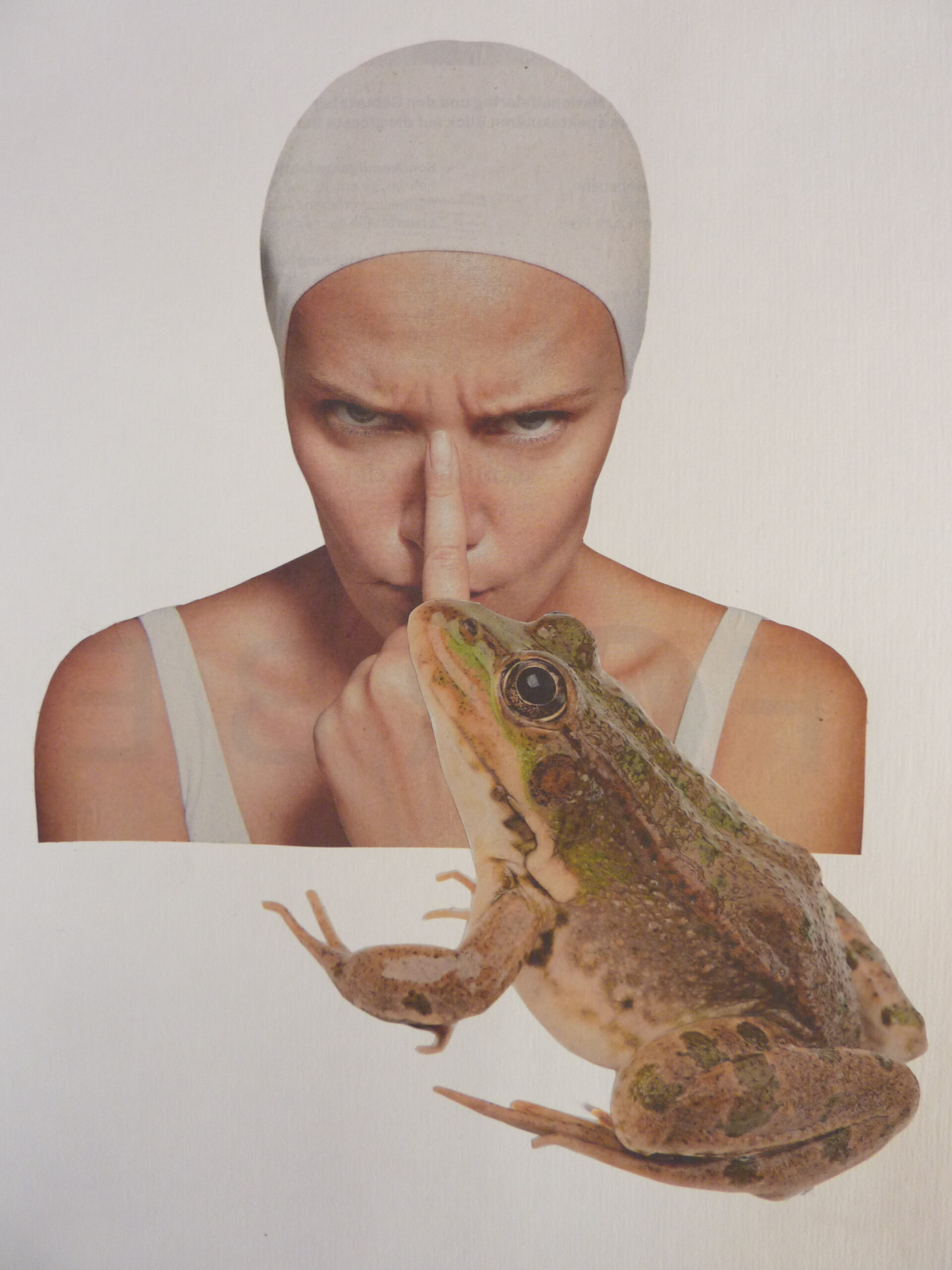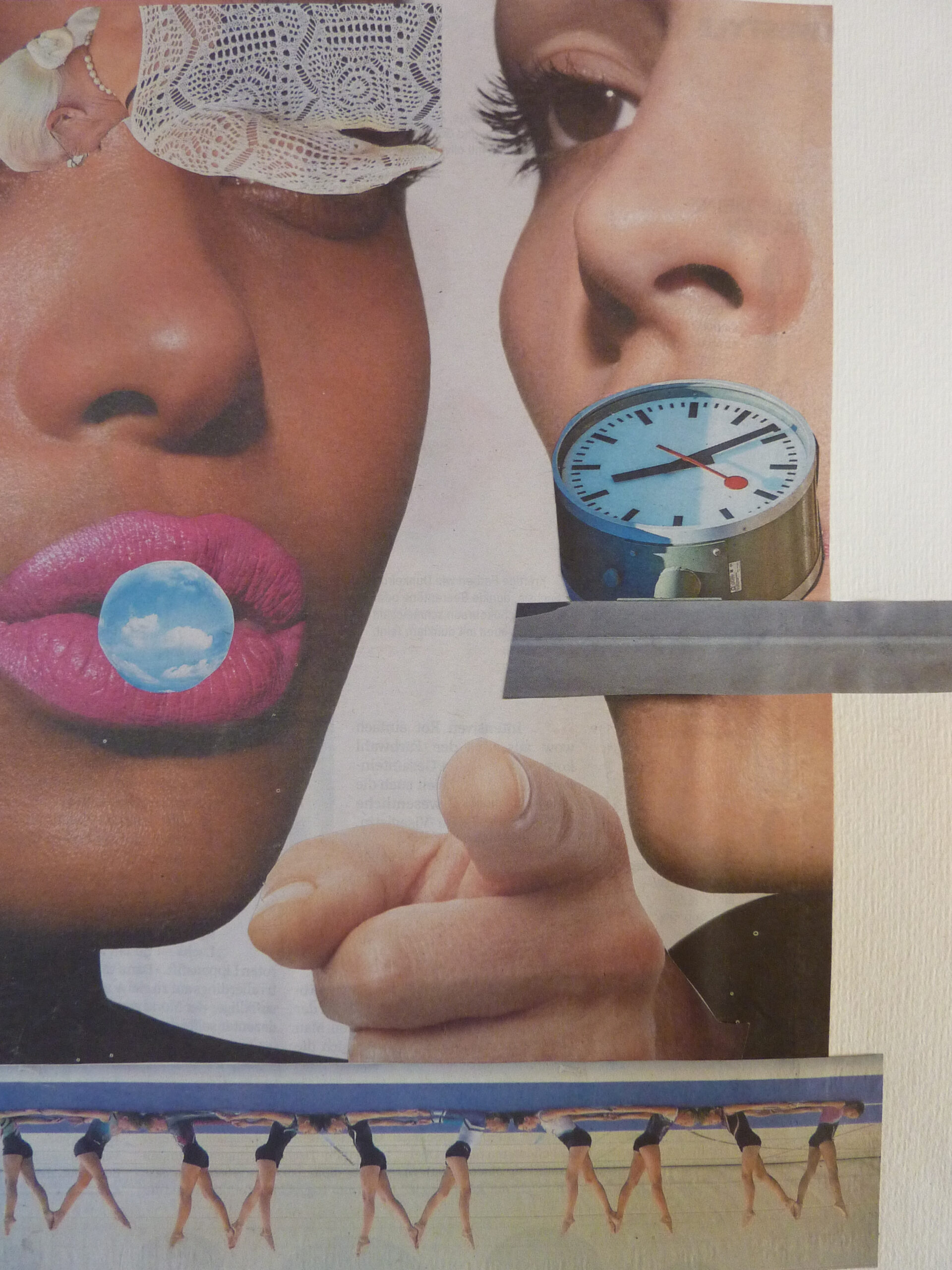 Einige meiner Collagen sind aus der Not entstanden, als auf der Alp kein anderes Material zur Verfügung stand. Bilder aus alten Zeitungen oder Zeitschriften regen meine Fantasie an und geben ein Thema vor. Mit Ironie und Scharfsinn und «bewaffnet» mit Leim und Schere entstehen Bilder im Fokus der Kunst.